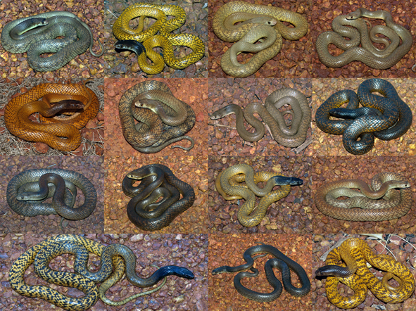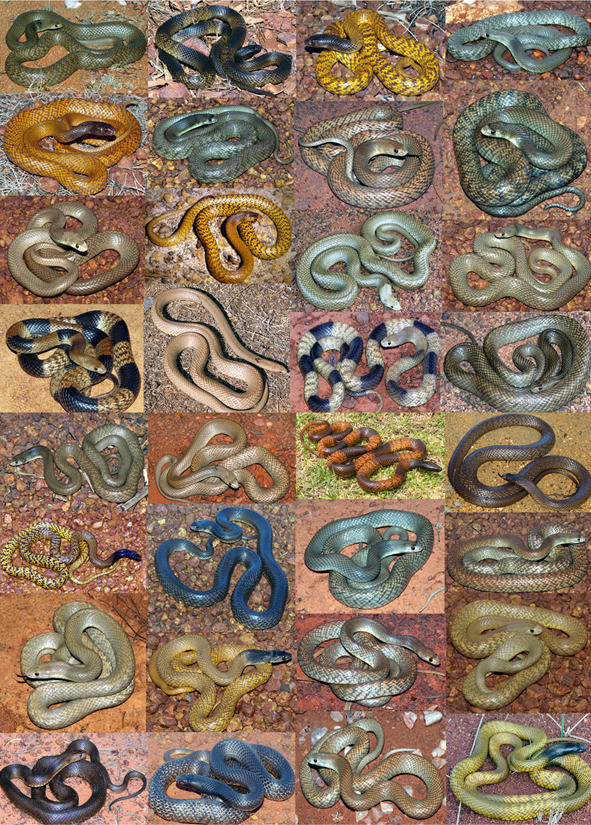 A dangerously venomous snake with tremendous variation in colour and pattern - some colour morphs are illustrated below. This snake is very abundant in close proximity to human dwellings and is involved in most snakebite deaths in Western Australia (eight of last thirteen WA fatalities attributed to snakes).